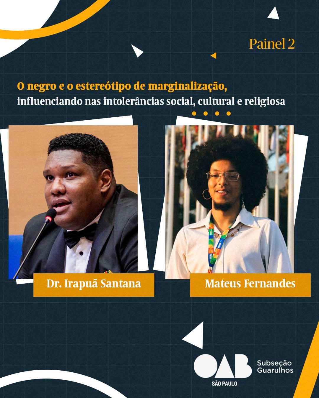 Palestrante: Dr. Irapuã Santana - sócio do escritório BFBM – Barroso Fontelles, Barcellos, Mendonça Advogados; presidente da Comissão de Igualdade Racial da OAB/SP, doutor em Direito Processual pela UERJ; ex-assessor de ministro no STF e no TSE; advogado voluntário da Educafro; colunista do jornal O Globo.