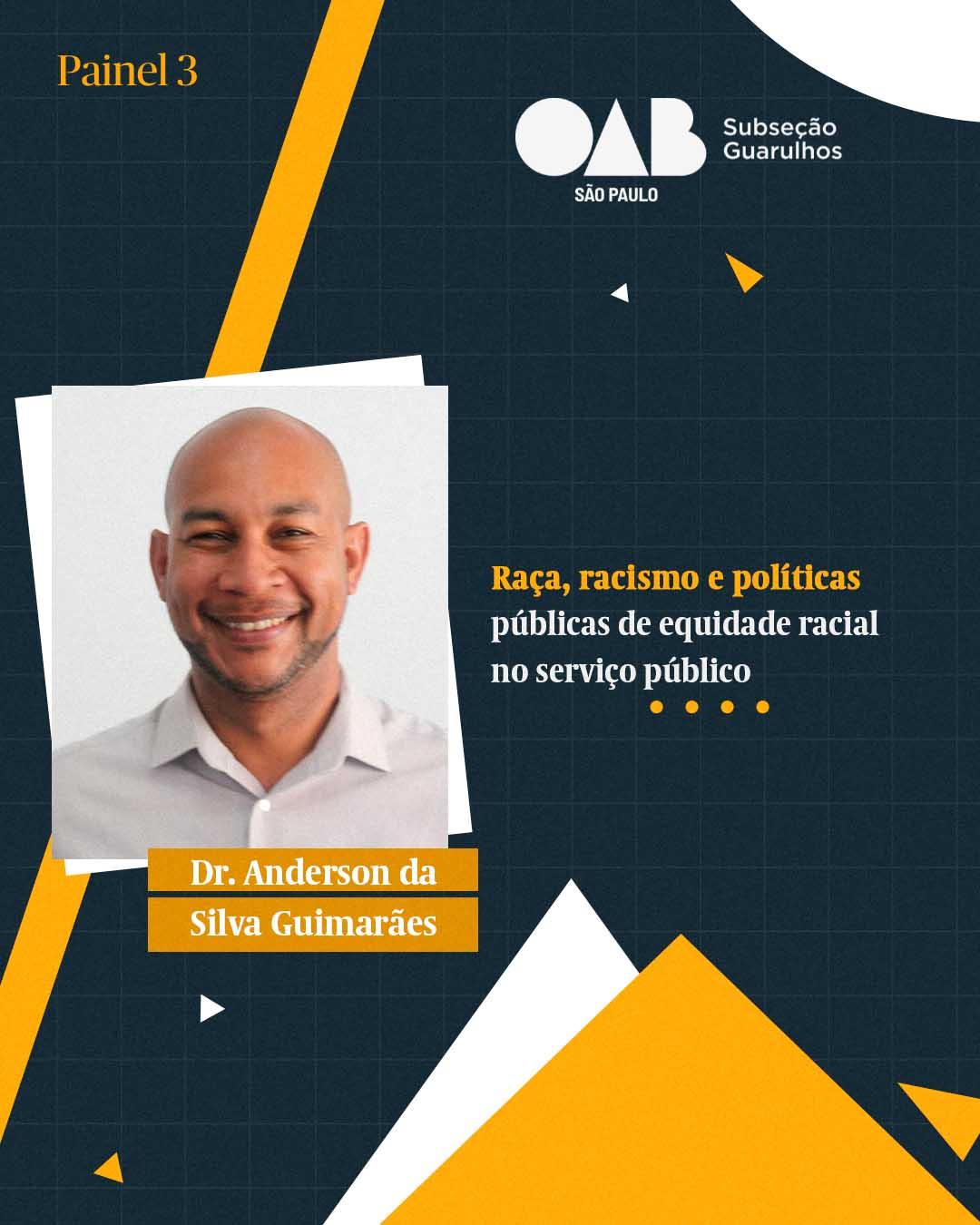 Palestrante: Anderson da Silva Guimarães - especialização em Administração Pública e Gestão Governamental; fisioterapeuta pós-graduado em Saúde Pública. Foi assessor de Gestão na Secretaria de Saúde da Prefeitura de Guarulhos, Chefe de Gabinete da Câmara Municipal de Guarulhos. Designado para o cargo de Subsecretário de Direitos Humanos na implementação de Políticas da Igualdade Racial da Prefeitura de Guarulhos. Presidente do Compir por dois mandatos (2017 a 2021). Membro ativo do Grupo de Trabalho Intersetorial e Permanente da Saúde da População Negra, Indígena, Cigana e Migrantes, do Grupo Técnico de discussão de Segurança Alimentar avocado ao Fundo Social, e Grupo Técnico de Cuidados à População de Rua; representante governamental em projetos de articulação direta junto ao Estado de São Paulo no Programas Parcerias Municipais.
