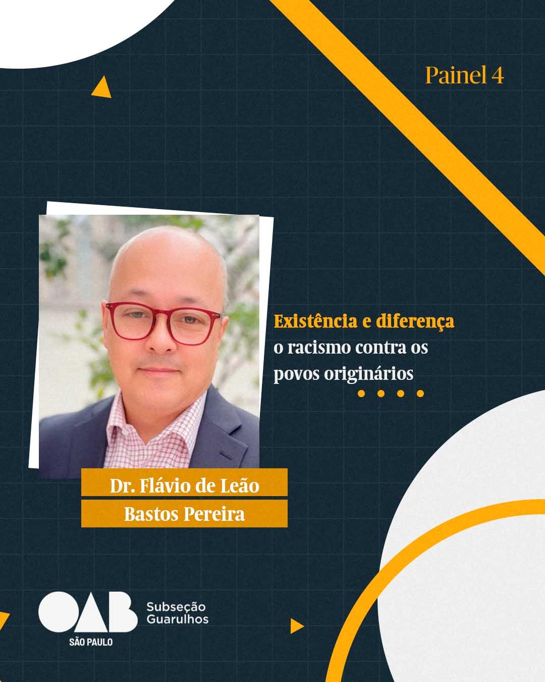 Palestrante: Dr. Flávio de Leão Bastos Pereira - advogado em Direitos Humanos; coordenador do Núcleo da Memória da Comissão de Direitos Humanos da OAB/SP; membro da Comissão da Verdade de Osasco; conselheiro do Núcleo da Memória Política de SP, membro do Comitê Gestor do Memorial da Luta Pela Justiça e do GT DOI-CODI. Pós-Doutorado em Direito. Especialista em Genocídios (Universidade de Toronto/Inst. Zoryan; líder do grupo de pesquisa sobre Justiça de Transição da Faculdade de Direito da Universidade Presbiteriana Mackenzie; correspondente do Blog sobre J. de Transição do Mackenzie. Autor da obra “Genocídio Indígena no Brasil: Desenvolvimentismo entre 1964 e 1985”; e coordenador do Núcleo de Documentos Indígenas e Quilombolas da CDH-OAB/SP.