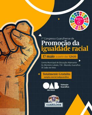 Interessados em participar da discussão construtiva da igualdade étnico-racial podem se inscrever no 1º Congresso Guarulhense de Promoção da Igualdade Racial, que irá ocorrer no próximo dia 17, a partir das 12h30, no Adamastor (avenida Monteiro Lobato, 734, Macedo). As inscrições devem ser feitas no link sympla.com.br/oabguarulhos. O evento é gratuito e as vagas são limitadas.