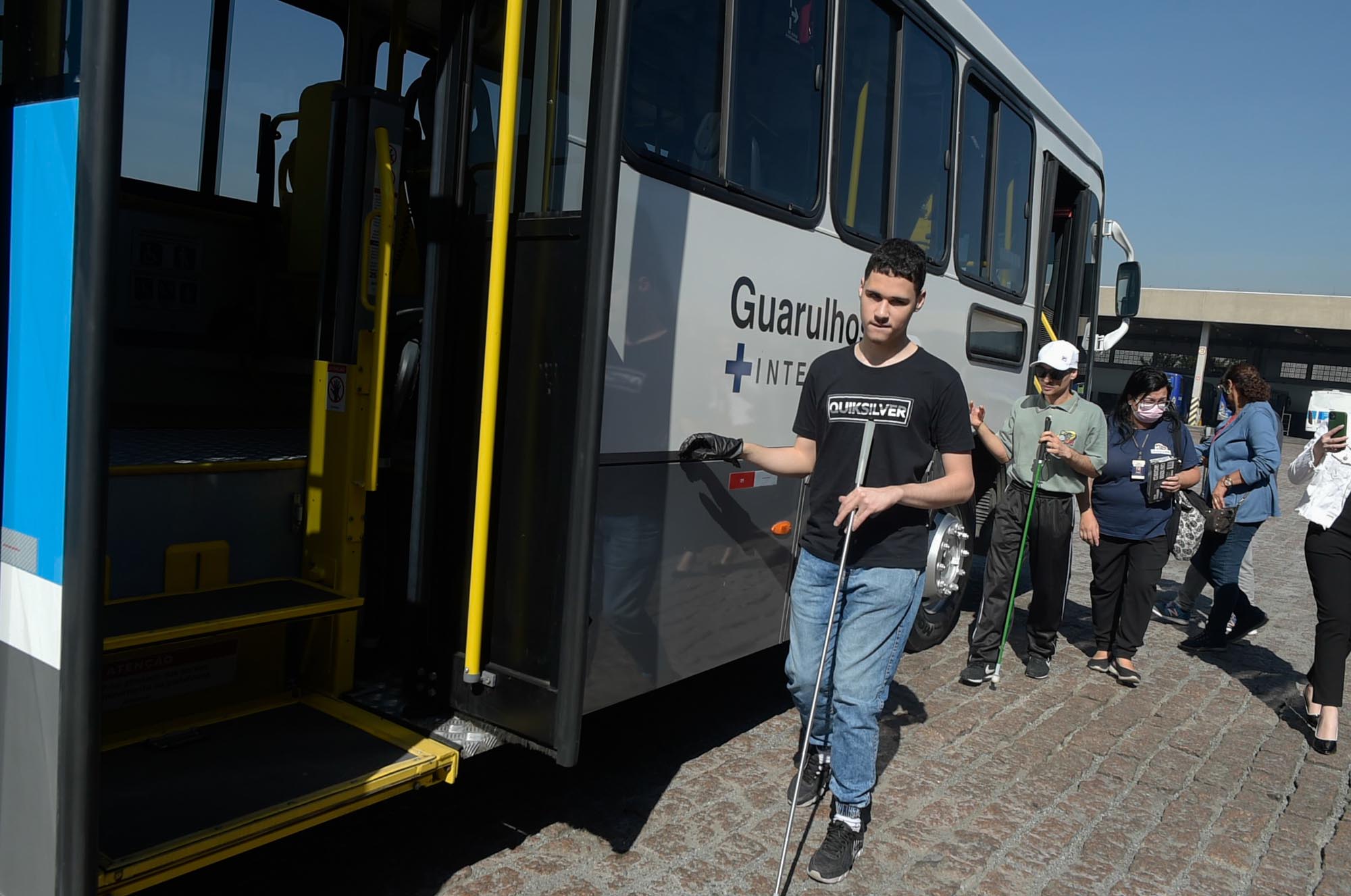 Três alunos com deficiência visual do projeto Práticas Educativas para Inclusão Social (Peis) da Prefeitura de Guarulhos visitaram nesta sexta-feira (22) a garagem de ônibus da empresa Vila Galvão, no Jardim Santa Francisca. A ação, que faz parte do treinamento para uso da bengala e deslocamento pela cidade, possibilita aos participantes o conhecimento dos componentes da parte interna do ônibus, como os assentos reservados, a catraca, o validador, as barras onduladas que indicam o assento reservado, a plataforma elevatória, as saídas de emergência, entre outros.