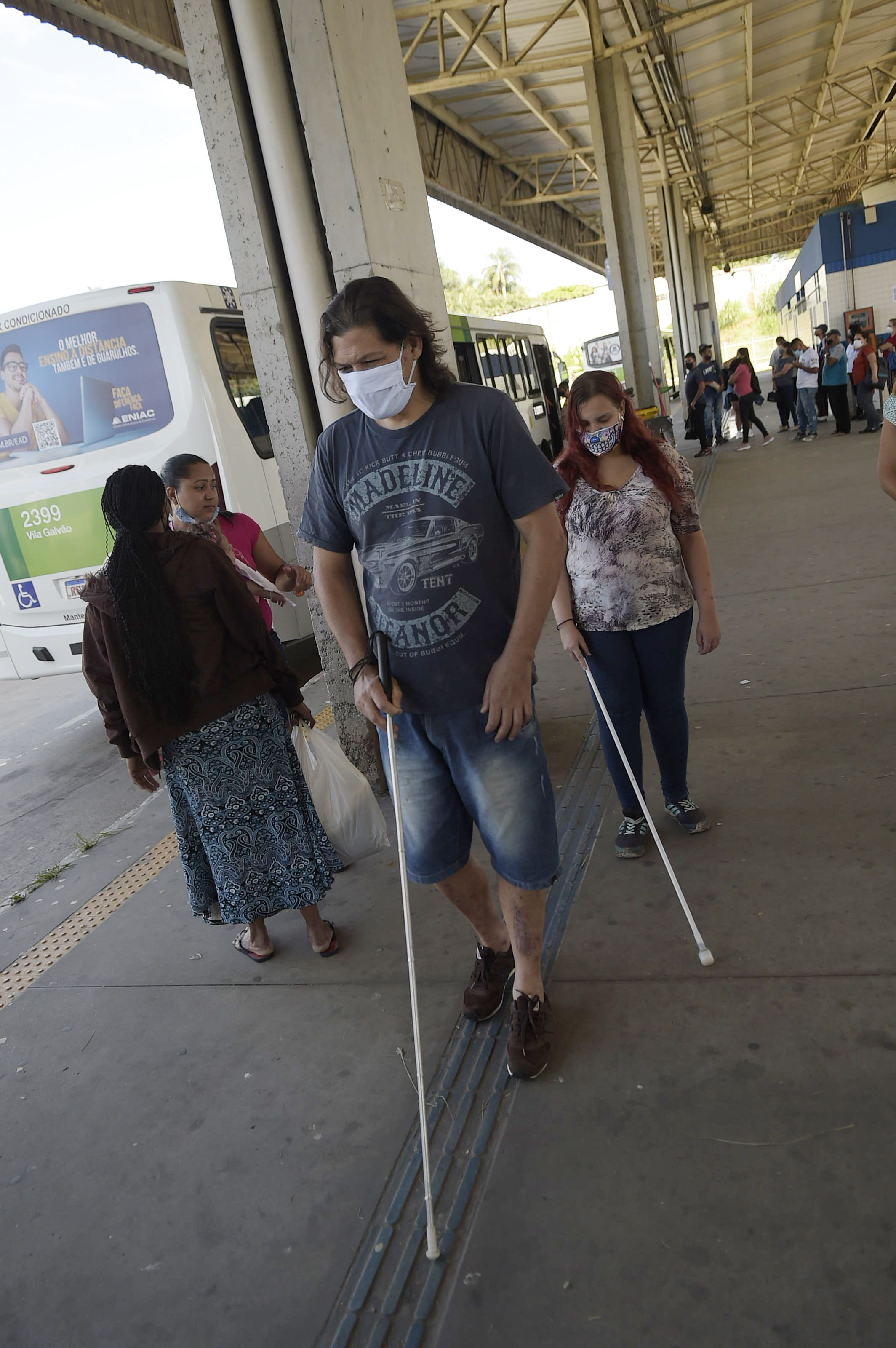 Em visita ao Terminal de Ônibus São João nesta quarta-feira (9), os alunos do projeto Práticas Educativas para Inclusão Social (Peis), desenvolvido pela Prefeitura de Guarulhos, por meio da Subsecretaria de Acessibilidade e Inclusão, vinculada à Secretaria de Direitos Humanos, utilizaram técnicas para deslocamento no piso tátil direcional e exploraram os componentes do interior do ônibus, além de treinar a comunicação com o motorista, que é um importante agente na rede de apoio da pessoa com deficiência visual.