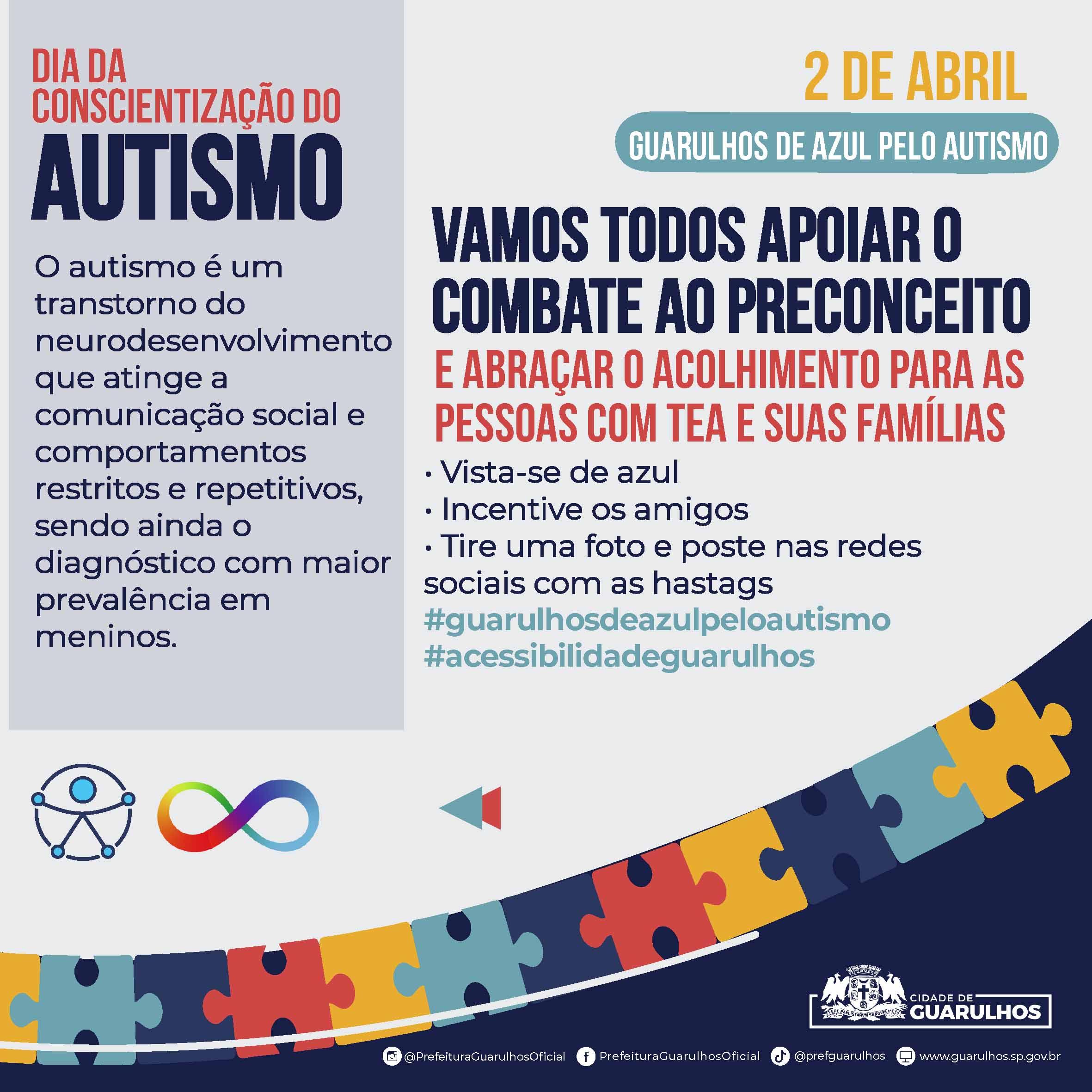 Em comemoração ao Dia Mundial do Autismo, celebrado na próxima terça-feira (2), a Prefeitura de Guarulhos lança uma campanha para que a população se vista com uma peça de roupa na cor azul nessa data. A iniciativa é da Subsecretaria de Acessibilidade e Inclusão e visa a sensibilizar a sociedade sobre as pessoas com transtorno do espectro autista (TEA) e promover a inclusão social.