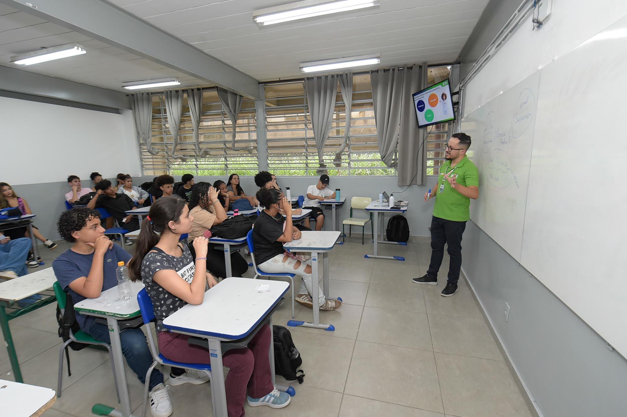 A Prefeitura de Guarulhos promoveu nesta quarta-feira (12) mais uma edição do projeto Juventude na Escola para 320 alunos da EE Maria Helena Faria Lima e Cunha, no Recreio São Jorge. A iniciativa da Subsecretaria da Juventude leva informações e orientações sobre cidadania, saúde mental, acessibilidade, empregabilidade e atividades culturais a estudantes do ensino médio na própria instituição.