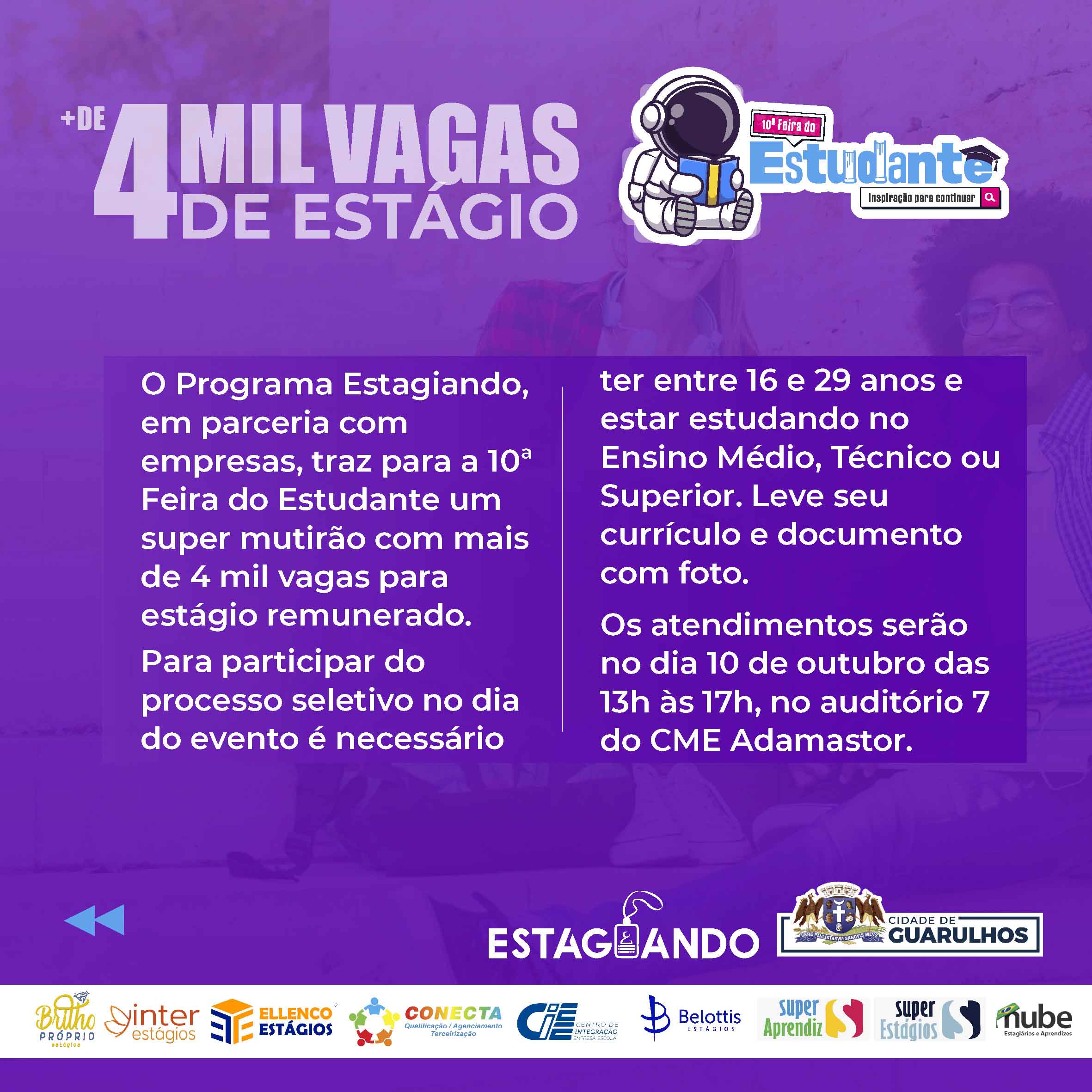 Realizado em parceria com as empresas Belottis Estágios, Brilho Próprio Estágios, CEG Conecta, CIEE, Ellenco Estágios, Inter Estágios, Nube, Super Aprendizes e Super Estágios, o Estagiando faz parte da 10ª Feira do Estudante de Guarulhos, que estima receber um público de 15 mil visitantes nos dias 9 e 10 de outubro, das 9h às 21h.