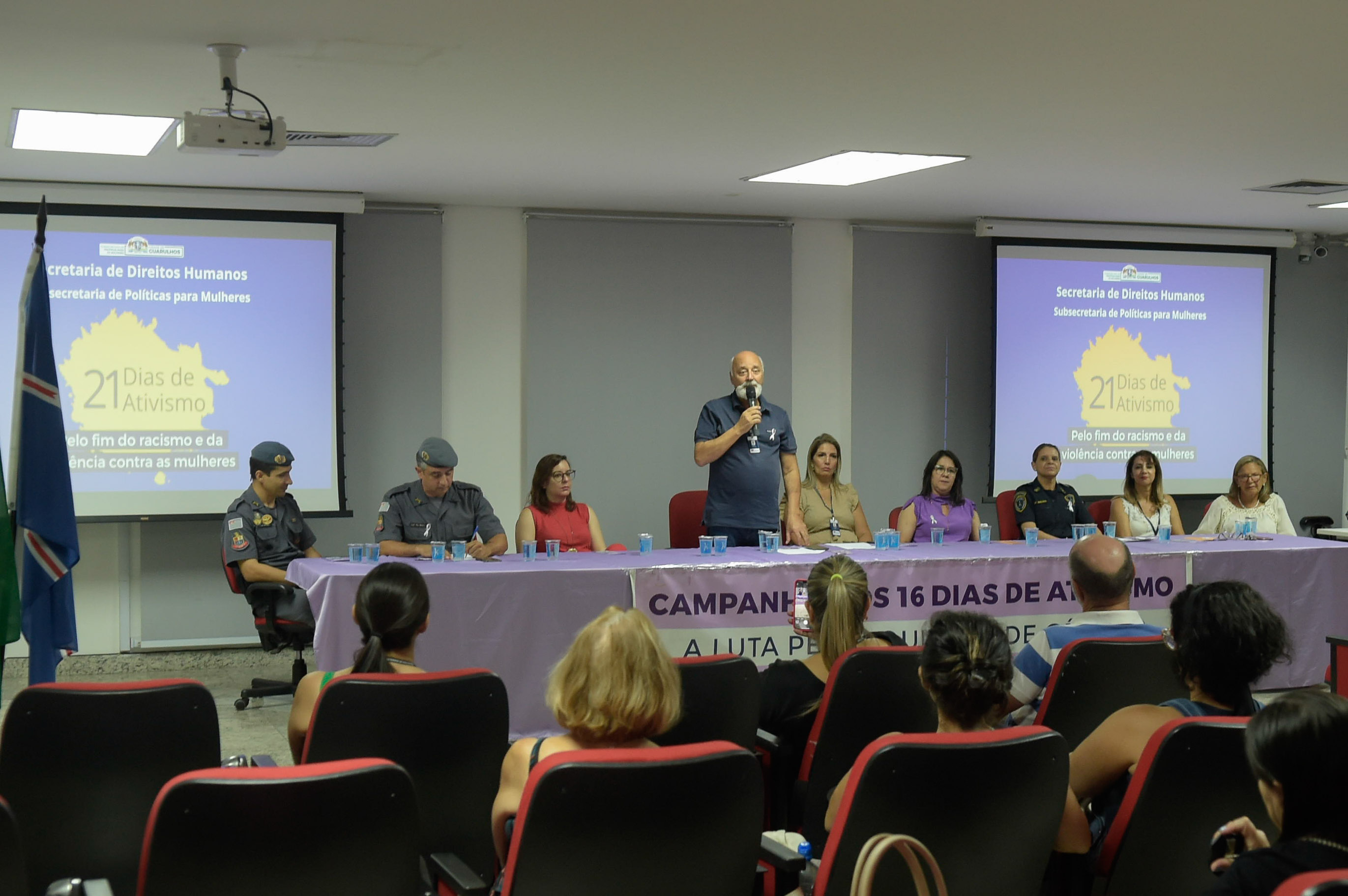 Uma solenidade marcou nesta sexta-feira (17) a abertura oficial da campanha “16 + 5 Dias de Ativismo pelo Fim da Violência Contra As Mulheres”, com o tema Guarulhos, Acolhendo e Protegendo, no auditório da Secretaria de Educação. A iniciativa da Prefeitura de Guarulhos tem como objetivo sensibilizar e mobilizar a população sobre o assunto por meio de atividades e orientações em diversos bairros, como rodas de conversa, palestras e a distribuição do laço branco – um movimento em que os homens assumem o compromisso de não cometer e nem permitir a violência contra a mulher.