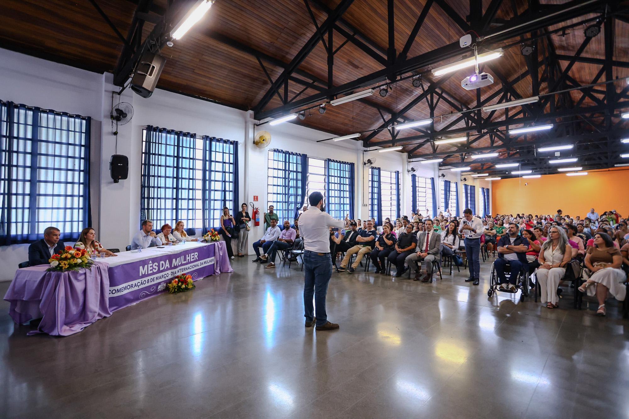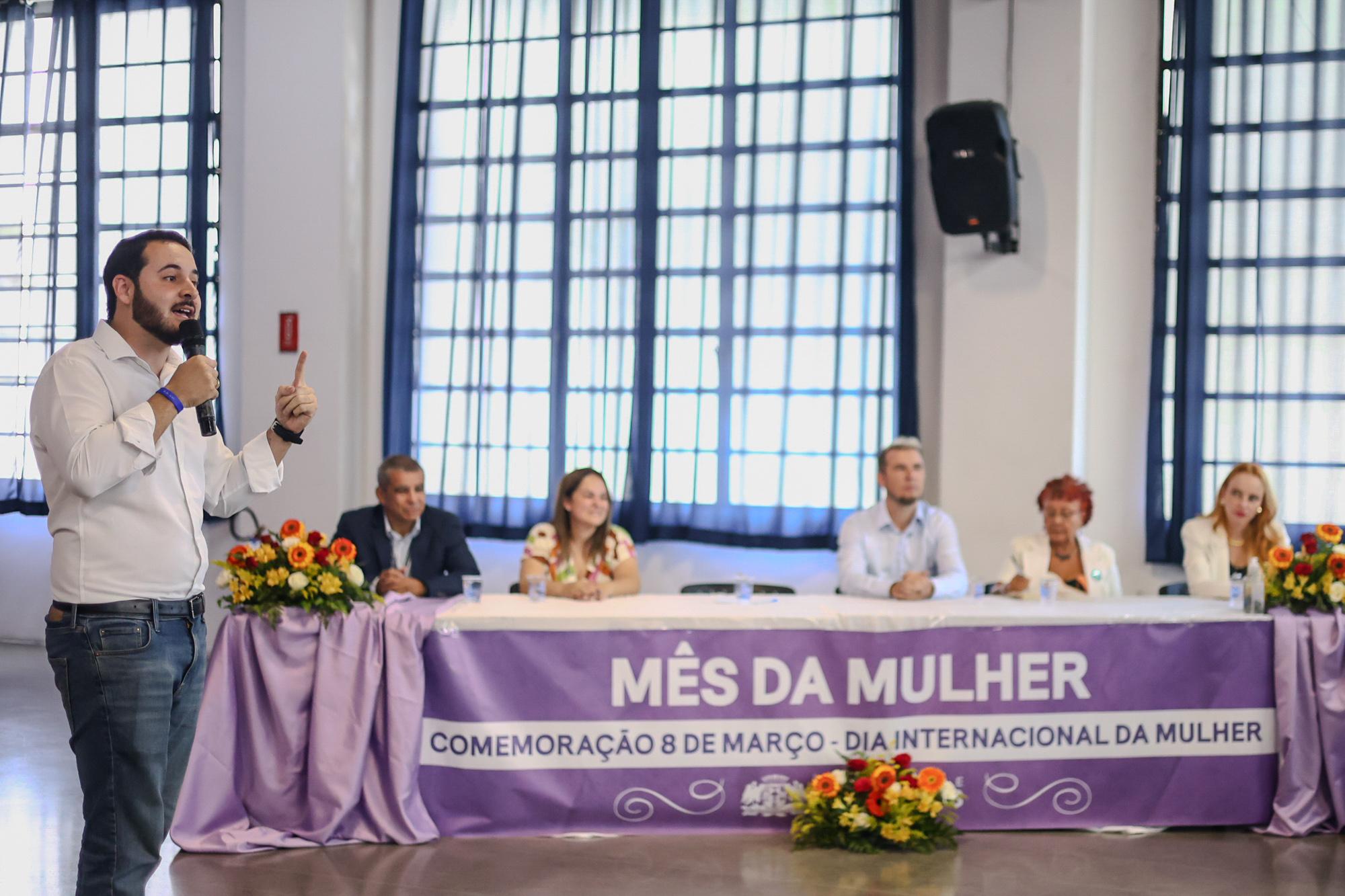 Um público de 310 pessoas, formado majoritariamente por assistidas pelas cinco Casas da Mulher Clara Maria, lotou o Salão de Artes do Adamastor nesta quinta-feira (13) durante a cerimônia oficial do Dia Internacional da Mulher, com o tema “Da visibilidade à realização: o protagonismo das mulheres”. Promovido pela Subsecretaria de Políticas para as Mulheres, o evento contou com as participações do prefeito Lucas Sanches, do vice-prefeito Thiago Surfista e da subsecretária Vanessa de Jesus, entre outras autoridades.