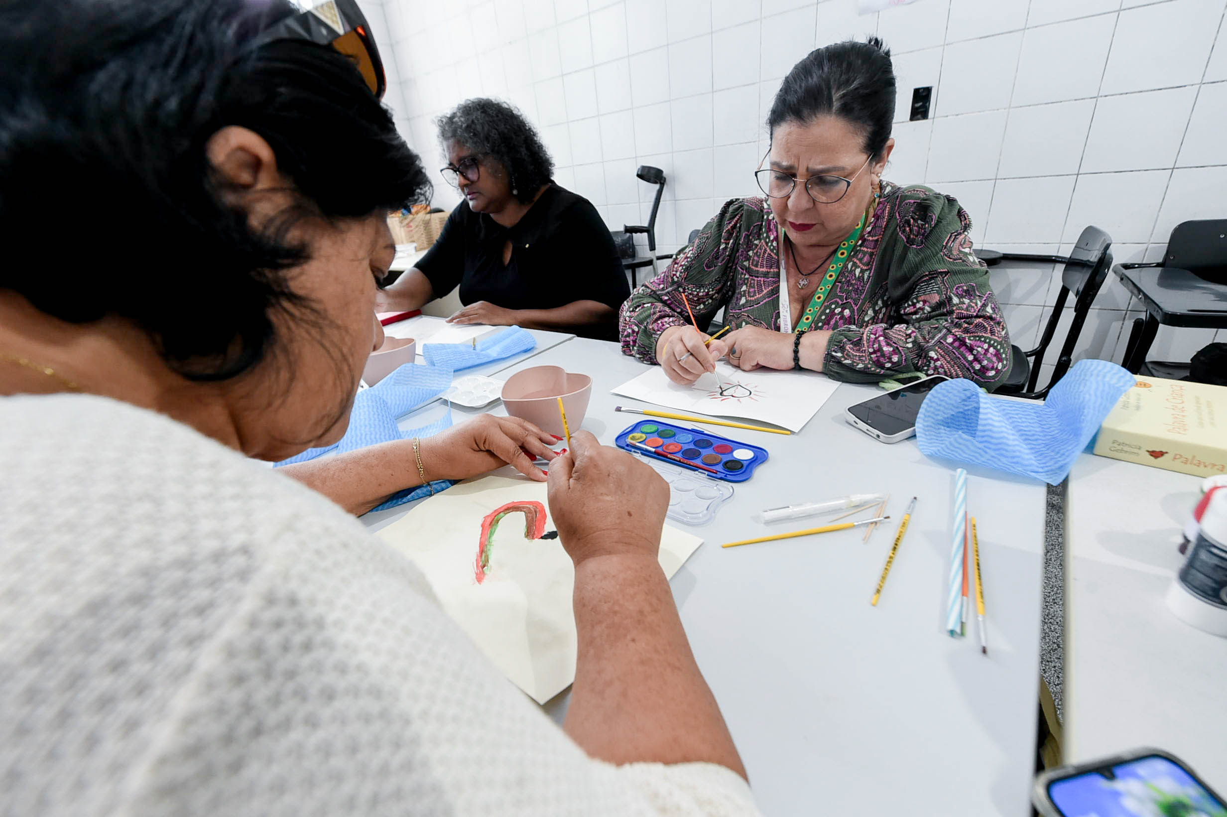 Nesta sexta-feira (27) a Subsecretaria de Acessibilidade e Inclusão promoveu a 3ª edição da vivência arte terapêutica gratuita Mulheres de Fibra: Transformando Dor em Cor para um grupo de mulheres diagnosticadas com fibromialgia, em sua sede, no Macedo. A proposta foi possibilitar que as participantes expressassem suas emoções através da pintura em aquarela, em um ambiente seguro com espaço para conversa e compartilhamento de experiências, formando uma rede de apoio entre elas.