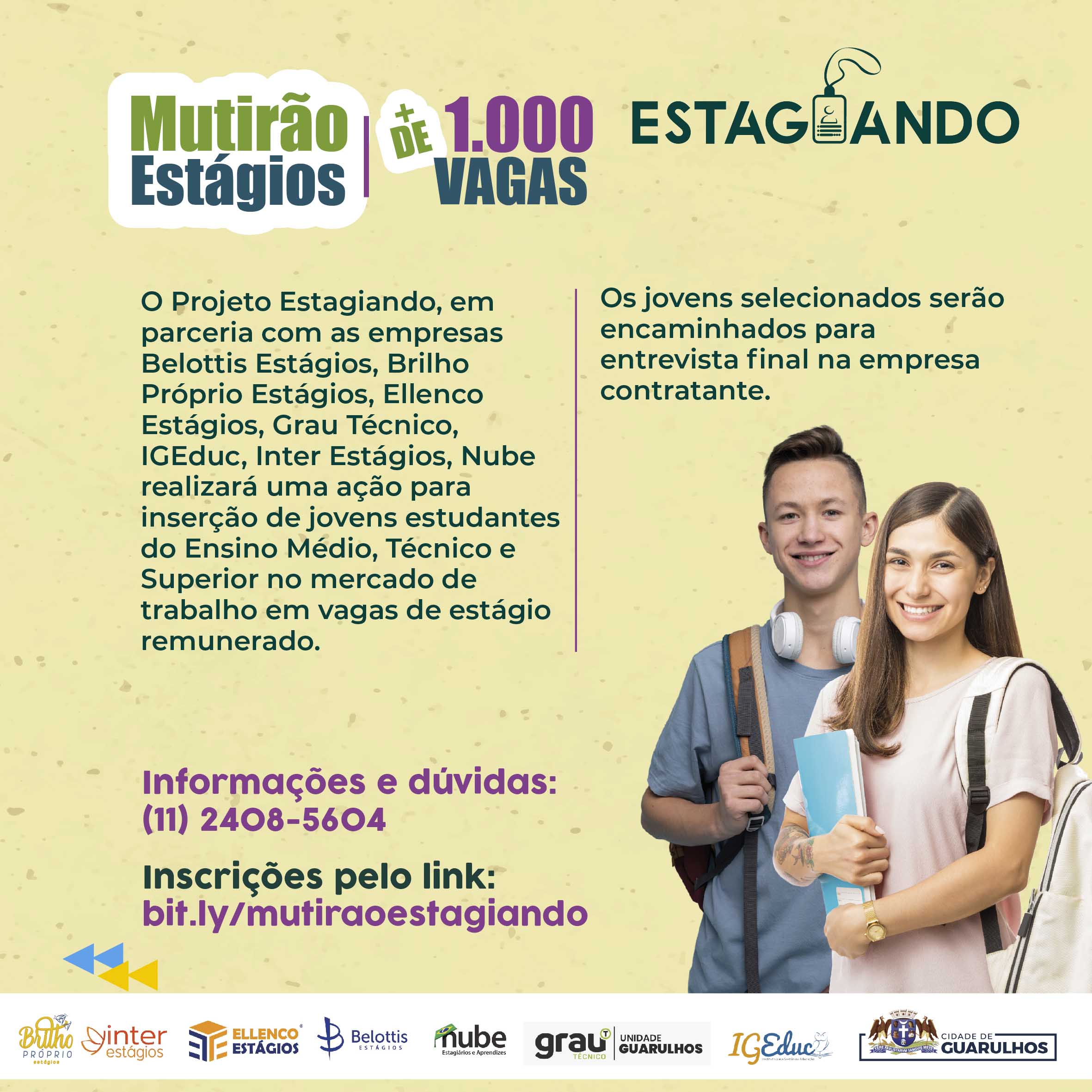 Mais de mil vagas de estágio remunerado em diversas áreas serão disponibilizadas pelo projeto Estagiando, o evento para jovens promovido pela Prefeitura de Guarulhos acontecerá no próximo dia 21, das 10h às 16h, no CEU Parque São Miguel (rua Joaquim Moreira, s/nº). Interessados devem se inscrever pelo link bit.ly/mutiraoestagiando e comparecer ao local com documento de identidade e currículo impresso.