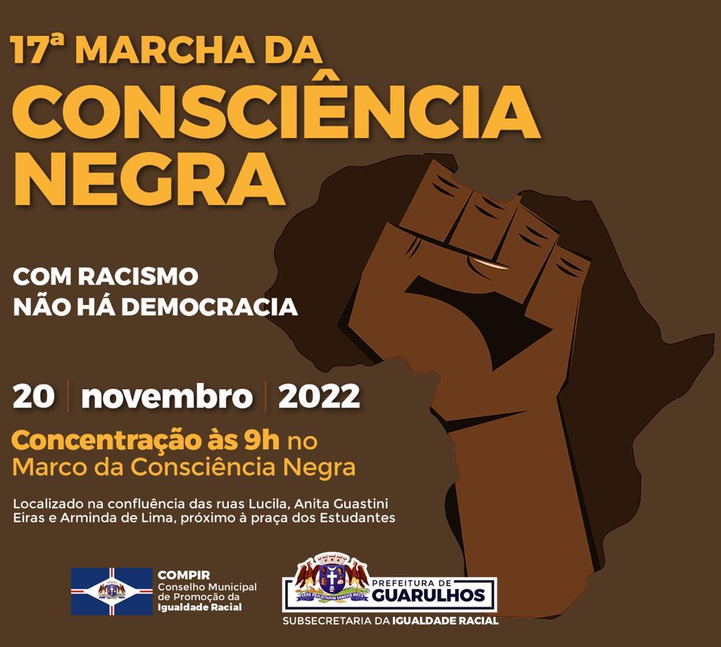 No Dia da Consciência Negra - 20 de novembro (domingo) – acontecerá a 17ª Marcha da Consciência Negra, organizada pela Subsecretaria da Igualdade Racial, integrante da Secretaria de Direitos Humanos, em parceria com o Conselho Municipal de Promoção da Igualdade Racial (Compir). A caminhada ocorre em alusão a Zumbi dos Palmares e sua concentração será a partir das 9h no Marco da Consciência Negra, localizado na confluência das ruas Lucila, Anita Guastini Eiras e Arminda de Lima, próximo à praça dos Estudantes (Centro).