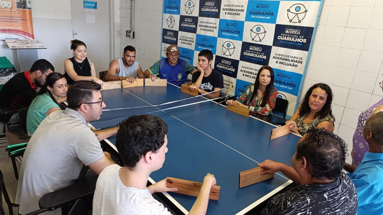 Alunos com deficiência visual do projeto Práticas Educativas para Inclusão Social, promovido pela Prefeitura de Guarulhos, participaram nesta segunda-feira (9) da oficina “Trabalhando a Ansiedade por Meio de Jogos Adaptados” na sede Subsecretaria de Acessibilidade e Inclusão, no Macedo. A iniciativa fez parte da programação gratuita da 4ª Semana de Direitos Humanos (https://bit.ly/4SemanaDHGru), que acontece em diversos locais da cidade até o dia 10.