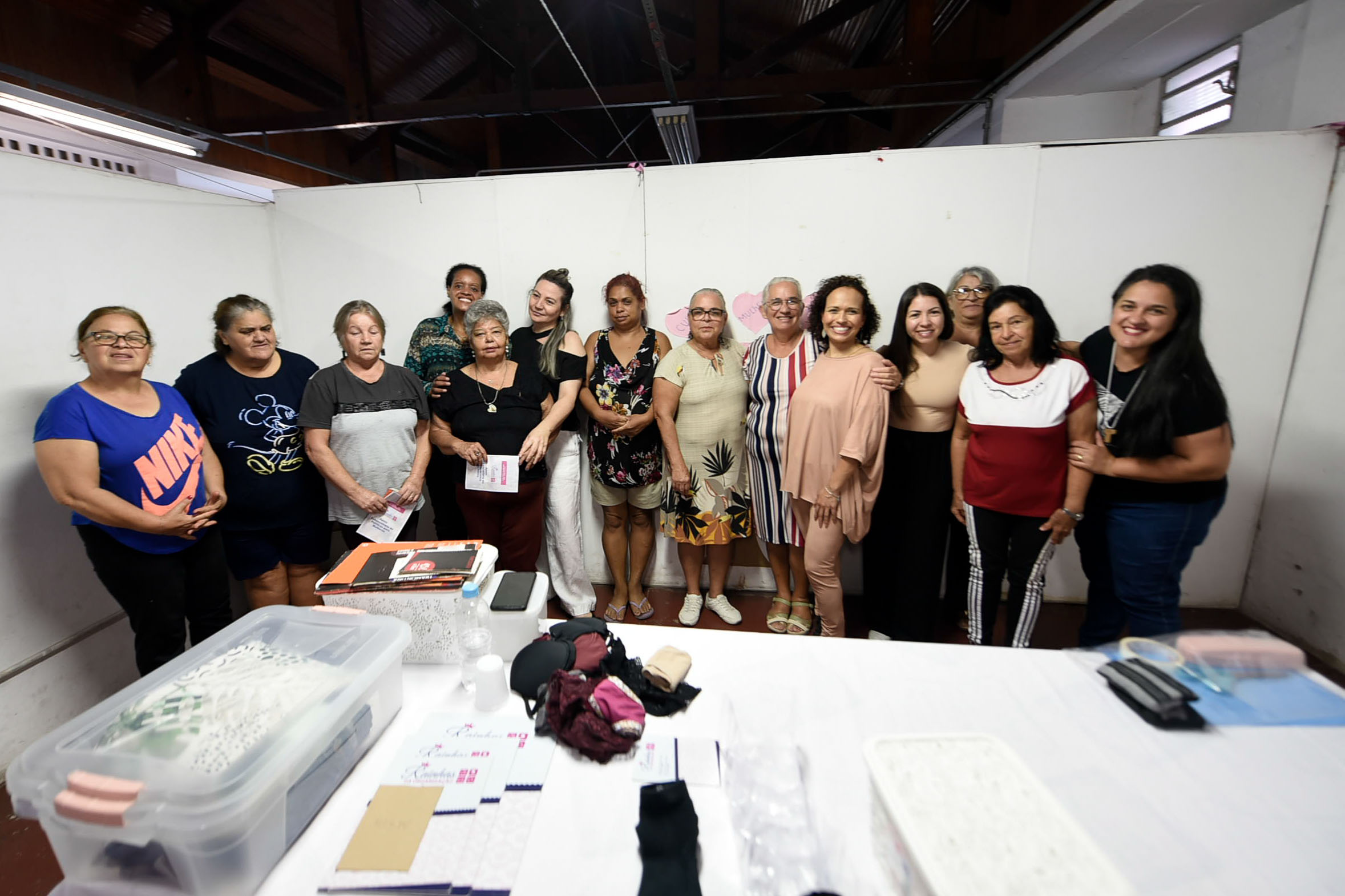 Entre os assuntos tratados pela voluntária estiveram: diferença de arrumar e organizar; benefícios da organização na sua vida; por onde começar; sobrecarga feminina e a divisão de tarefas; e parte prática (dobras, tipos de cabides, caixas e de colmeias).