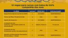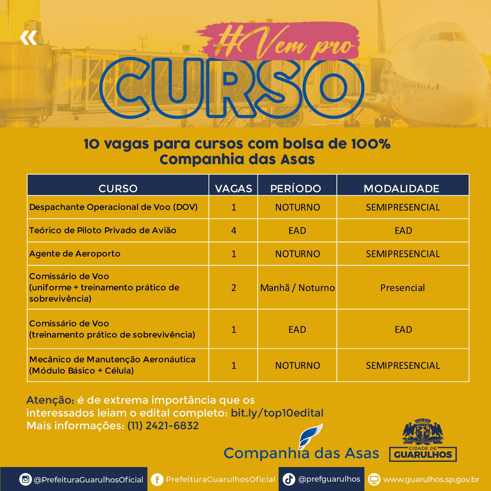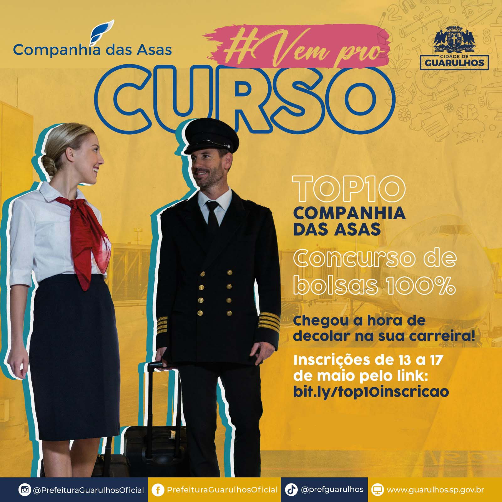 A Subsecretaria de Juventude de Guarulhos, em parceria com a escola de aviação Companhia das Asas, irá oferecer dez bolsas de estudos de 100% para jovens em situação de vulnerabilidade social para sete cursos: despachante operacional de voo (uma vaga), teórico de piloto privado de avião (quatro vagas), agente de aeroporto (uma vaga), comissário de voo (três vagas) e mecânico de manutenção aeronáutica (uma vaga). As inscrições para o processo de seleção foram abertas nesta segunda-feira (13) e se estendem até sexta-feira (17) pelo link bit.ly/top10inscricao.