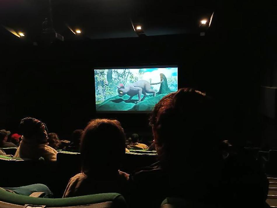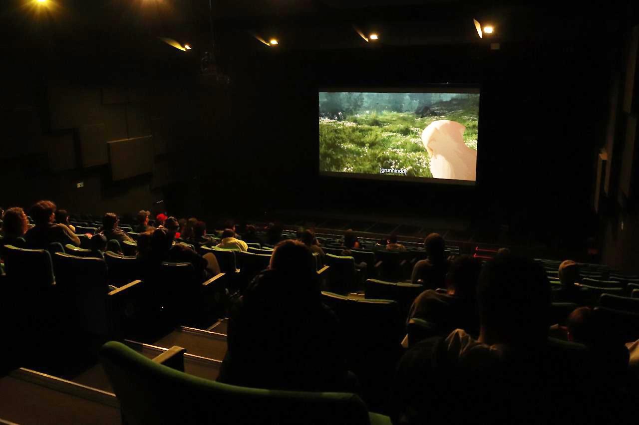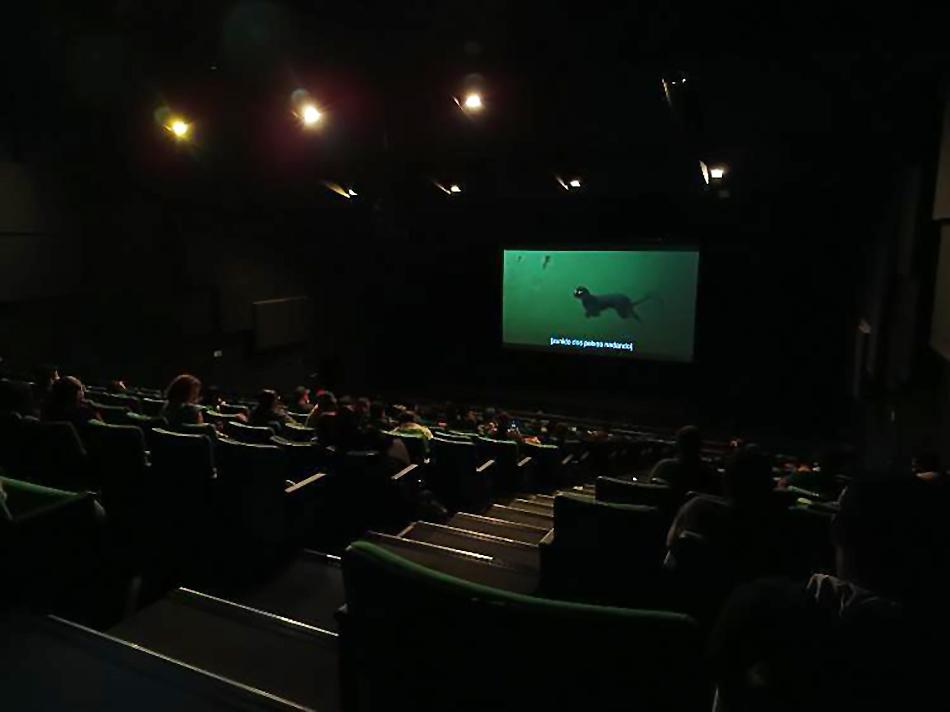 O grupo assistiu ao filme Flow, uma animação premiada com o Oscar este ano, em uma sala de exibição com luzes acesas e amenas, portas abertas e volume do som baixo.