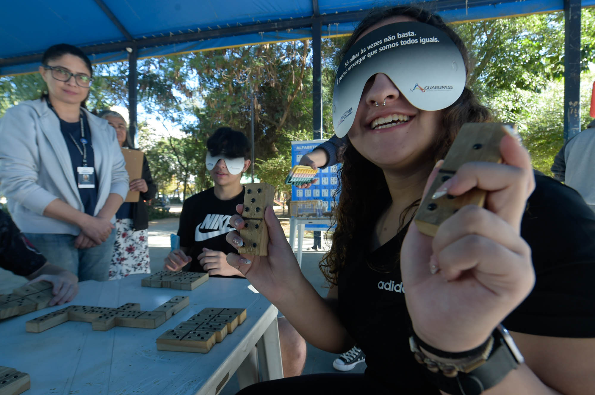 Acompanhada de colegas da escola, a estudante Clara Arcari, do primeiro ano do ensino médio, jogou dominó adaptado com os olhos vendados. “O jogo é muito legal. Quando coloquei a máscara achei angustiante, tive um sentimento de incapacidade. Foi uma sensação nova a de não poder ver as peças e escolhê-las. A venda no olho foi limitante e a gente precisou ter alguém pra nos auxiliar no jogo”, disse a jovem, moradora do Centro.