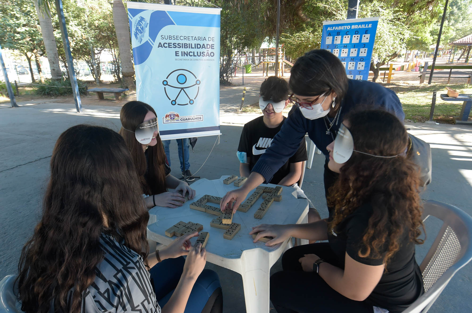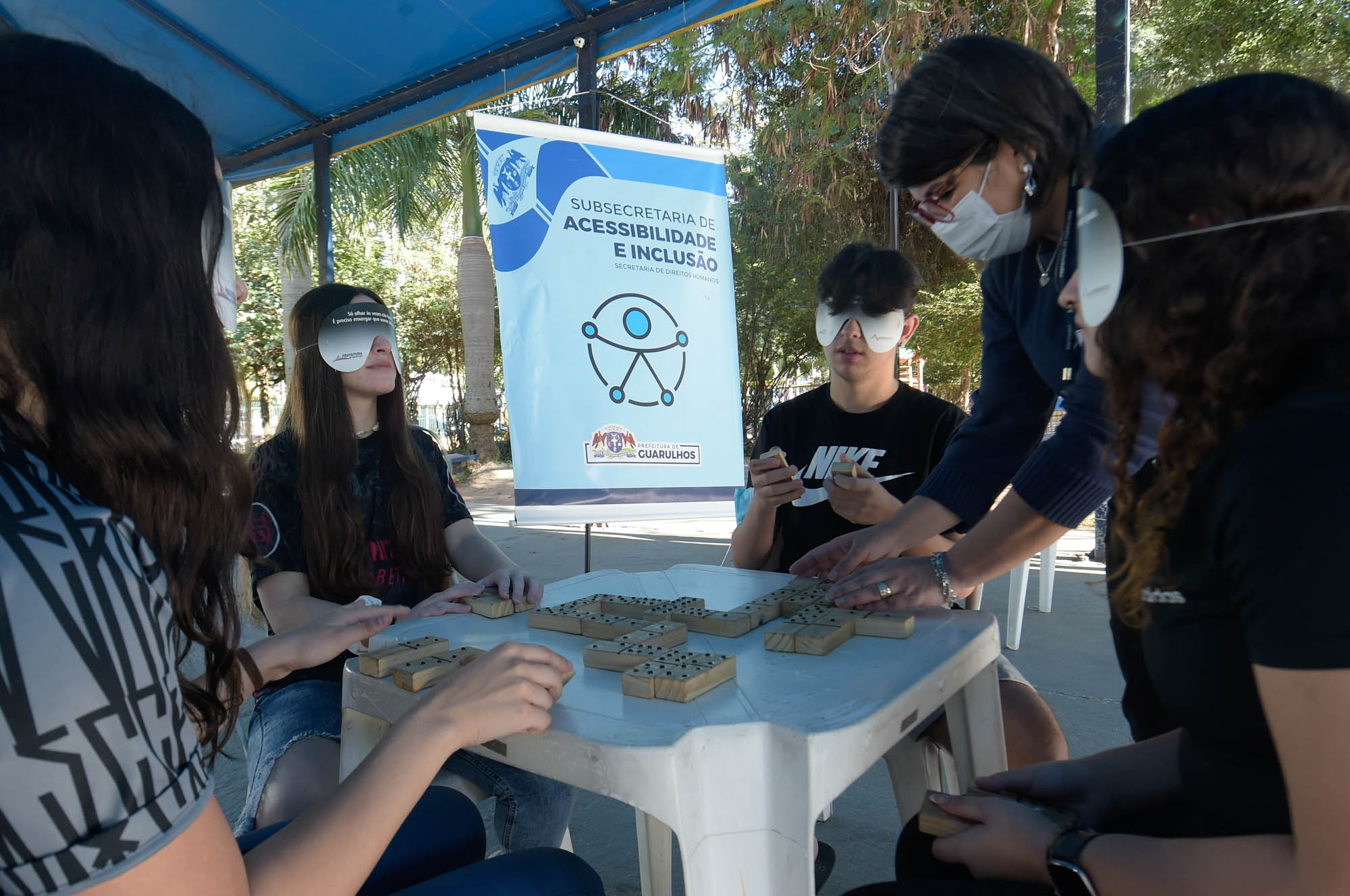 Os moradores de Guarulhos que passaram pela tenda do Bosque Maia na manhã desta quinta-feira (26) tiveram a oportunidade jogar dominó e basquete adaptados para que pudessem ter a sensação de estar no lugar de uma pessoa com deficiência. Trata-se de atividades lúdicas sensoriais realizadas pela Prefeitura de Guarulhos com o objetivo de sensibilizar a população sobre acessibilidade e inclusão.