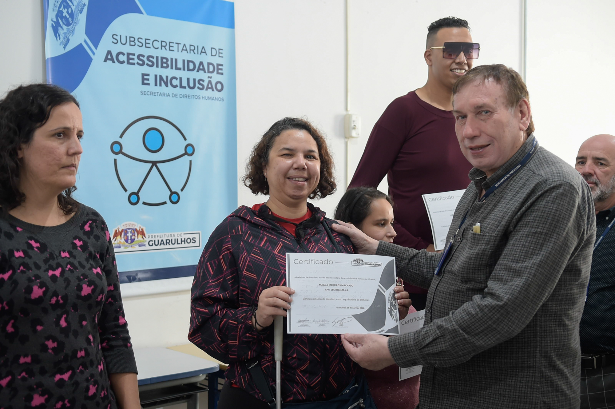 A Prefeitura de Guarulhos entregou nesta terça-feira (19) certificados de conclusão do curso de soroban online para alunos com deficiência visual do projeto Práticas Educativas para a Inclusão Social (Peis). O soroban é um instrumento adaptado para auxiliar o ensino e aprendizagem de cálculos matemáticos e aprimoramento do raciocínio lógico para pessoas com deficiência visual.