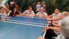Cada equipe tem seis participantes e são jogados três sets de 15 pontos cada. A atividade é feita com todos sentados em cadeiras ao redor de uma mesa oficial de tênis de mesa. As raquetes são diferenciadas e a bola contém esferas de metal para produzir o som, o qual possibilita às pessoas cegas jogarem também. Diferente do tênis de mesa, a bola não pode passar por cima da rede.