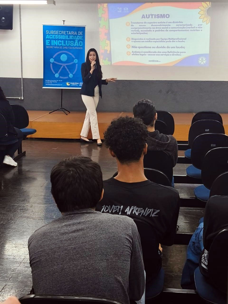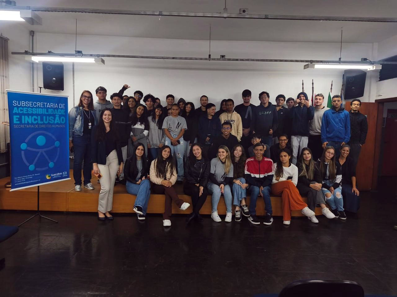 A Subsecretaria de Acessibilidade e Inclusão realizou nesta terça-feira (10) uma atividade formativa sobre anticapacitismo (combate à discriminação e ao preconceito contra pessoas com deficiência) para mais de 50 estudantes do ensino médio e do curso técnico administrativo da Escola Natasha Franco Vieira, no Jardim Cocaia.