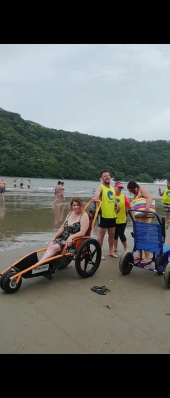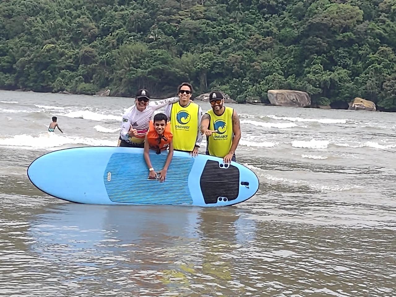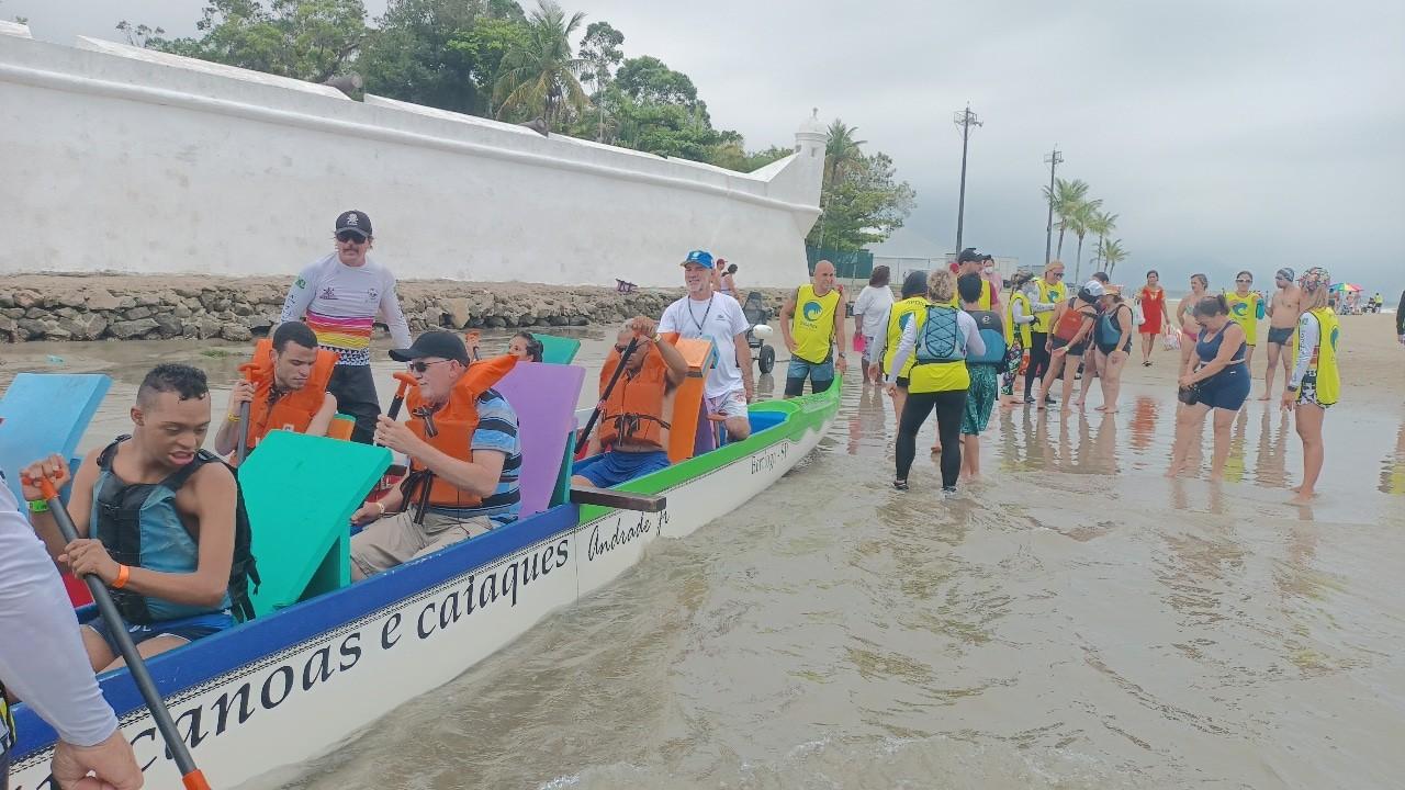No último sábado (3) a Prefeitura de Guarulhos levou um grupo de 40 pessoas com deficiência física, visual e intelectual, acompanhantes e funcionários da Subsecretaria de Acessibilidade e Inclusão, para a praia Enseada, em Bertioga. Elas puderam entrar na água com cadeira anfíbia, remar em caiaques e até surfar durante uma aula prática na prancha.