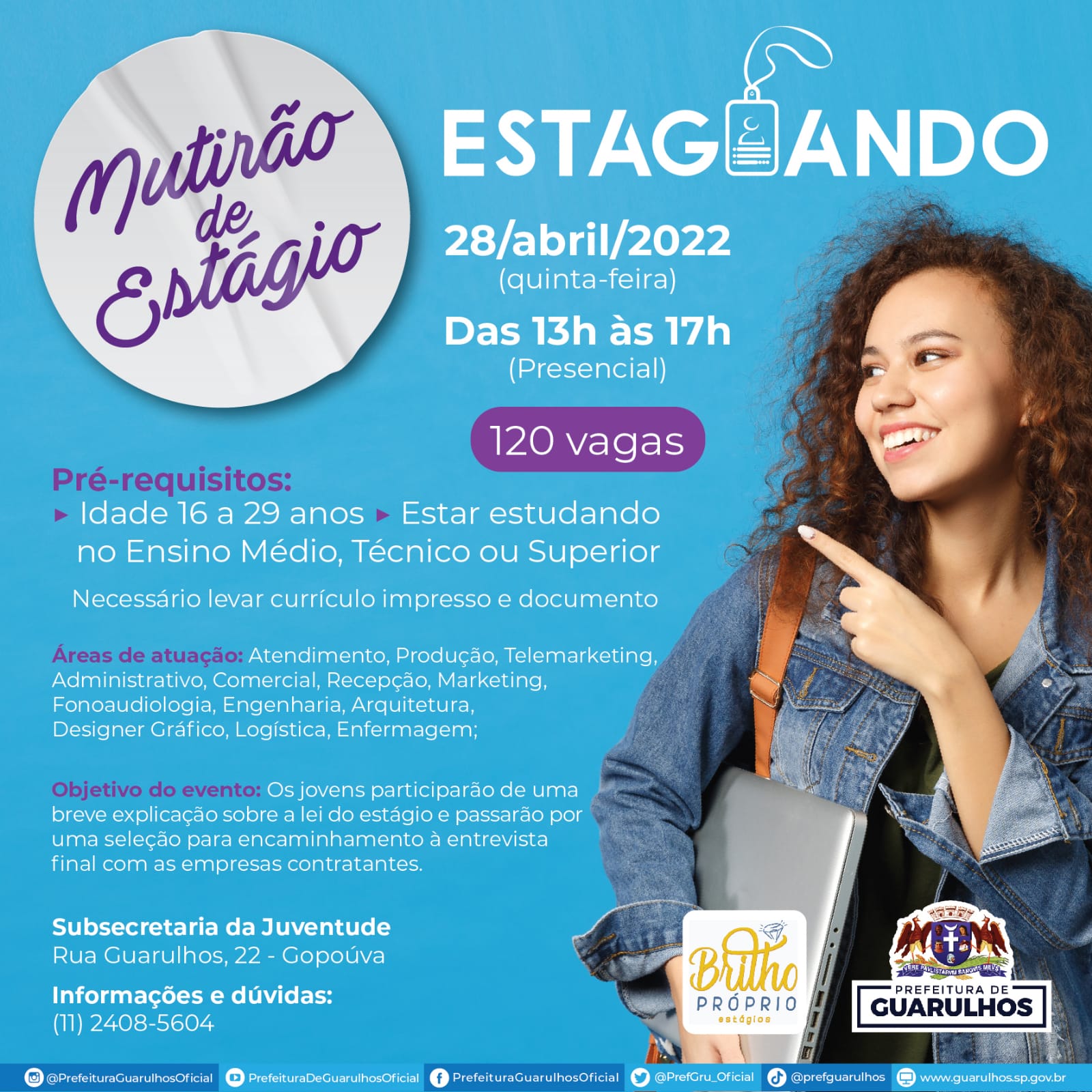 A Prefeitura de Guarulhos, em parceria com a empresa Brilho Próprio Estágios, realizará no próximo dia 28 o 5º mutirão do projeto Estagiando, das 13h às 17h, na Subsecretaria da Juventude (rua Guarulhos, 22, Gopoúva). O evento é voltado aos jovens entre 16 e 29 anos que estejam cursando ensino médio, técnico ou superior. É necessário levar documento e currículo impresso.