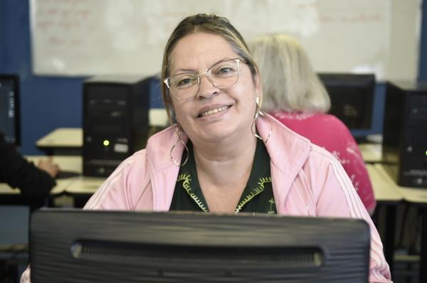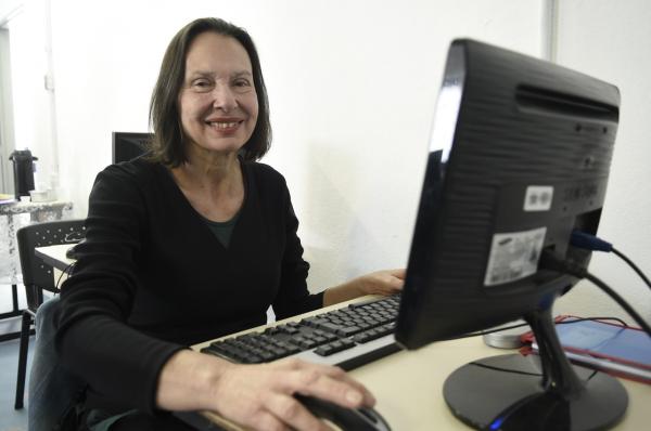 Aos 64 anos, Marinalva de Almeida Martins, aposentada pela Telefônica, cuidou da mãe com Alzheimer por 15 anos e se matriculou na aula para se atualizar e ficar por dentro do mundo, além de ocupar a mente. Ela está gostando muito do curso e, como não tem computador, usa o celular para treinar, mas pretende futuramente comprar um.