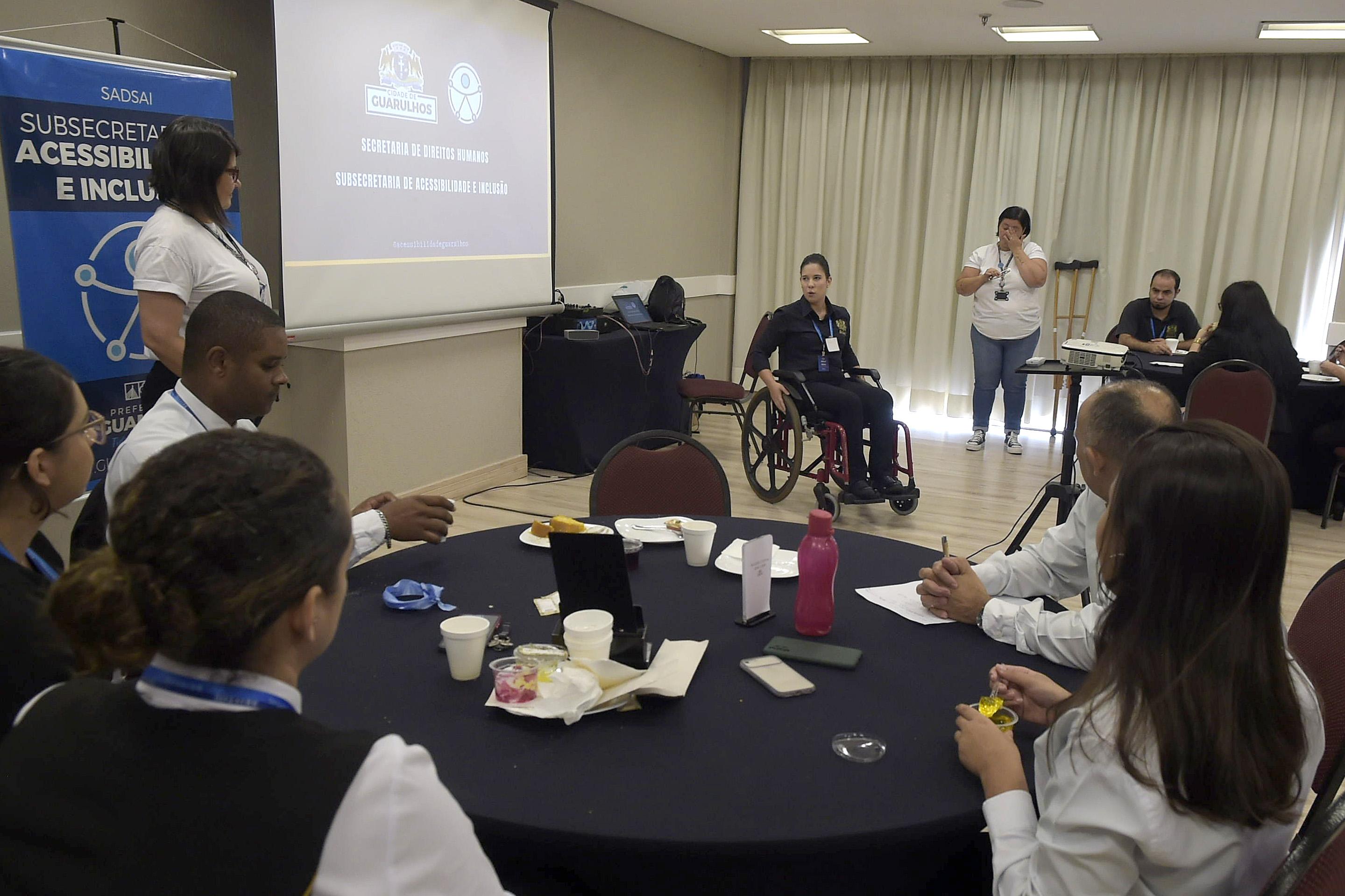 Cerca de 70 colaboradores do Hotel Bristol, no Jardim Santa Francisca, participaram nesta terça-feira (9) da oficina gratuita do projeto Vivência - Conhecer para Acolher, ministrada pela equipe da Subsecretaria de Acessibilidade e Inclusão (SAI), integrante da Secretaria de Direitos Humanos de Guarulhos. A iniciativa visa a sensibilizar empresas, prestadores de serviço e escolas sobre práticas inclusivas cotidianas que devem ser adotadas como forma de combate ao capacitismo e ao bullying.