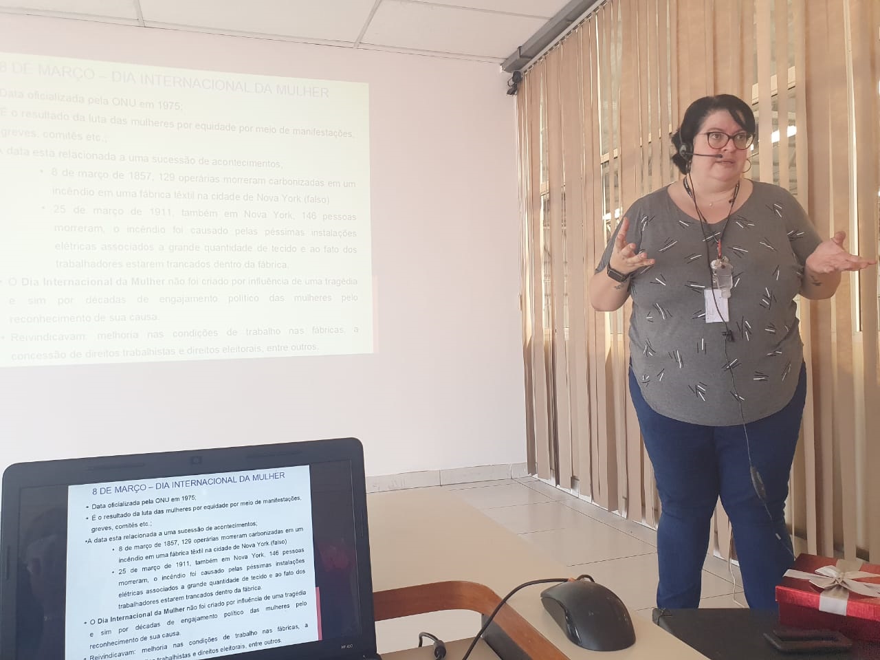 A apresentação foi feita pela assistente social da subsecretaria, Fabiana Chimirri, que discorreu sobre a história da mulher brasileira ao longo dos anos, a partir do século XVIII até a atualidade, a importância do empoderamento feminino e a representatividade da mulher nos espaços de poder.
