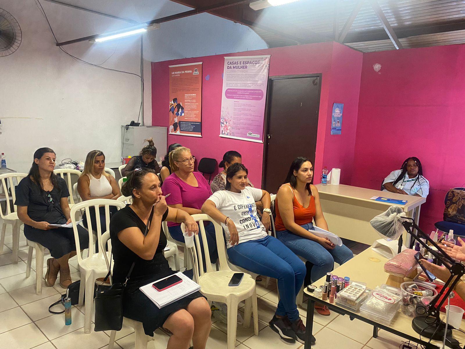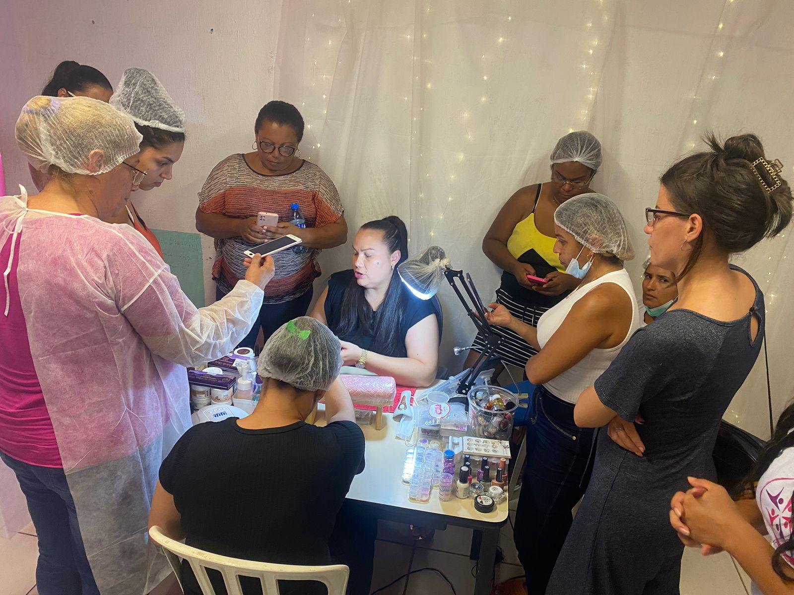 Nesta terça-feira (5) as alunas iniciantes do curso de alongamento de unhas da subsecretaria participaram da palestra Empreendedorismo na Casa da Mulher Clara Maria Recreio São Jorge, ministrada pela empresária e instrutora Graça Medeiros, que já foi manicure e hoje dá cursos e conferências sobre o assunto.