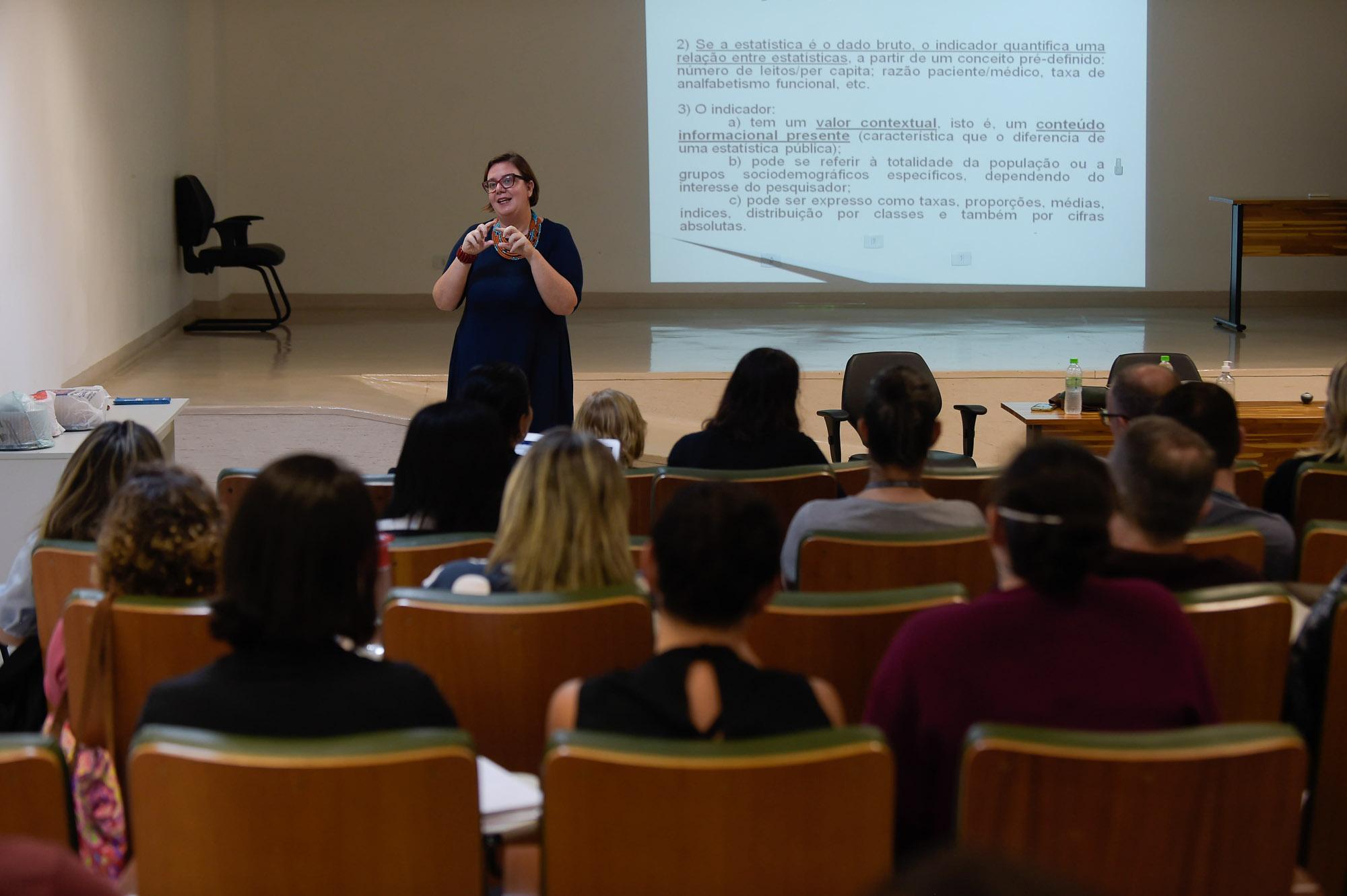 Segundo a docente, um indicador é formado a partir de uma estatística pública como um registro administrativo, estimativas, amostras, o censo demográfico, entre outros. “A estatística pública é um dado social na forma bruta não contextualizada em uma teoria social ou numa finalidade programática. O indicador quantifica uma relação com a estatística a partir de um conceito pré-definido”, explicou.