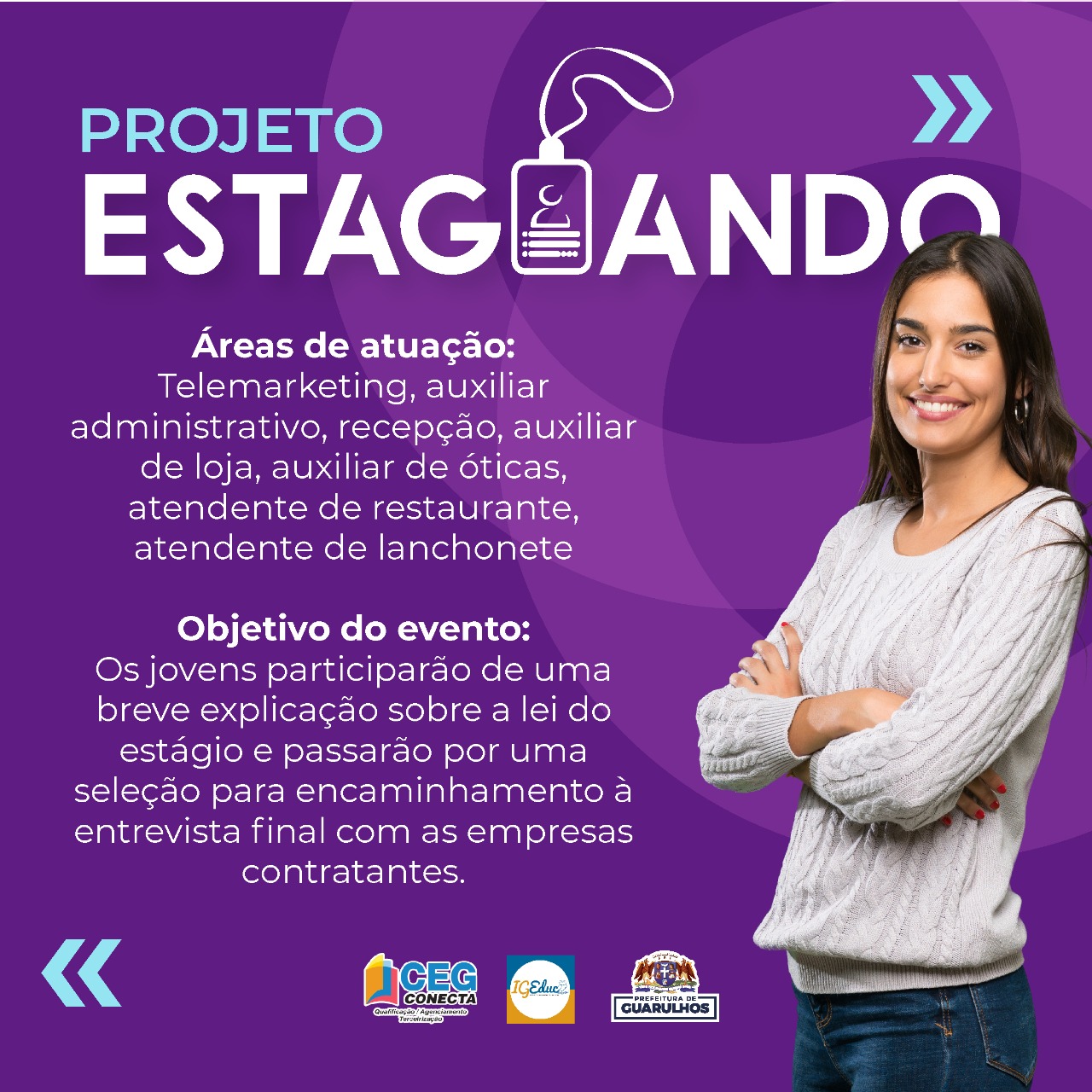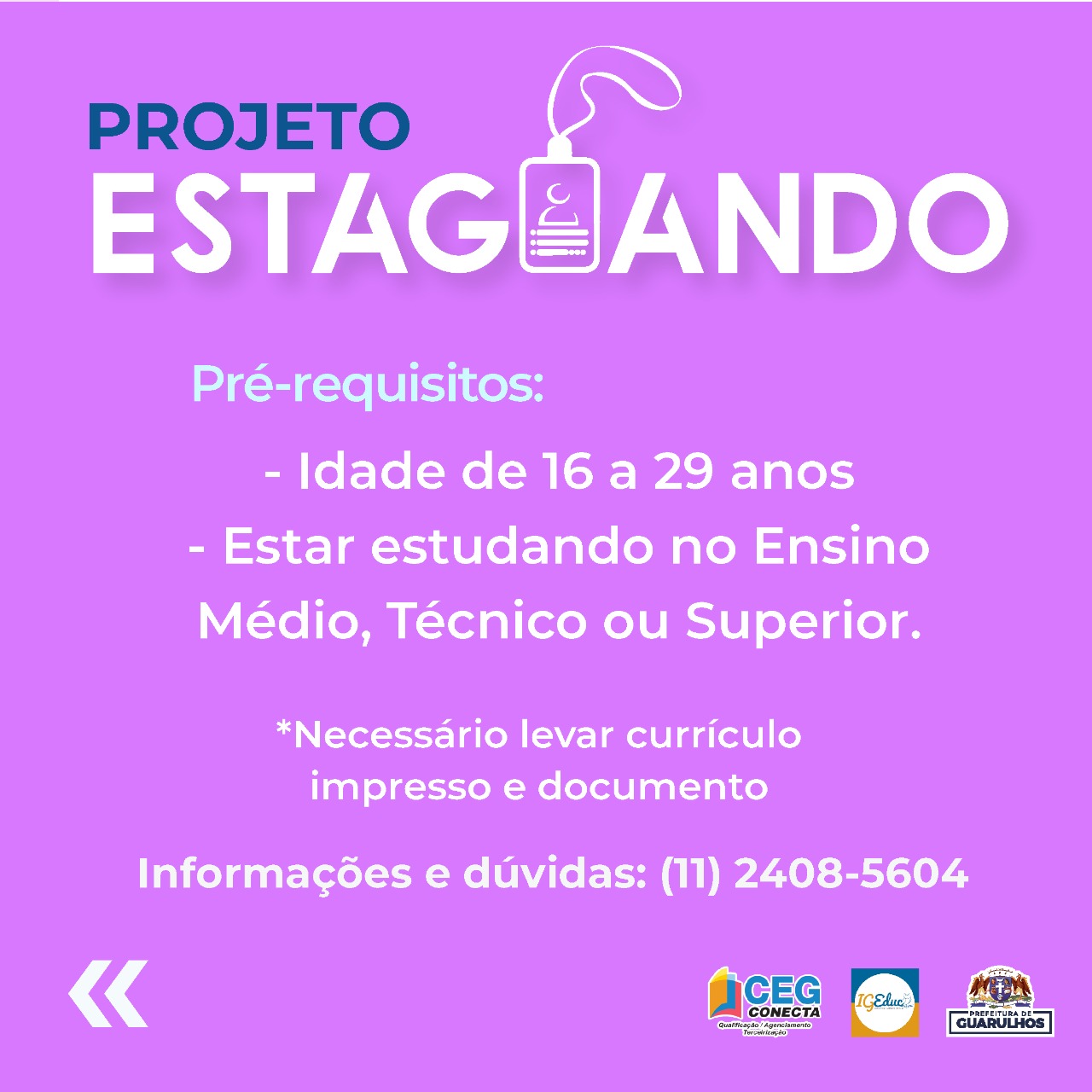 Estudantes do ensino médio, técnico e superior com idade entre 16 e 29 anos têm encontro marcado nesta quinta-feira (17), das 13h às 17h, no mutirão do projeto Estagiando, uma parceria da Prefeitura de Guarulhos com as empresas CEG Conecta e Instituto IGEduc. A iniciativa da Subsecretaria da Juventude, que integra a Secretaria de Direitos Humanos, busca inserir jovens estudantes em vagas de estágio remunerado.