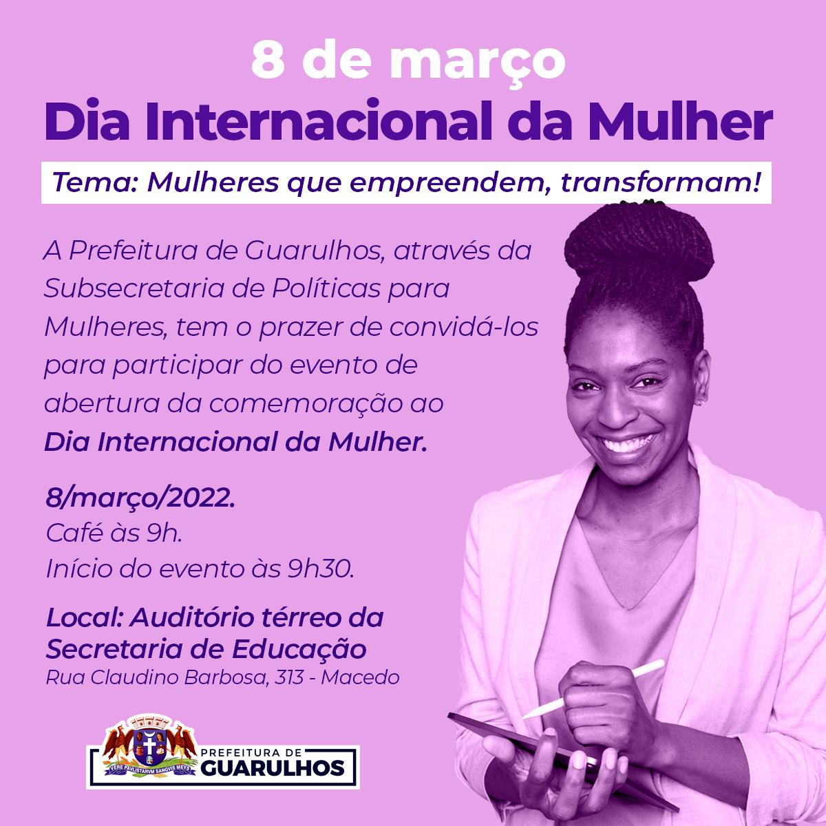 O Dia Internacional da Mulher será celebrado pela Prefeitura de Guarulhos na próxima terça-feira (8), às 9h30, no auditório térreo da Secretaria de Educação (rua Claudino Barbosa, 313, Macedo) com um evento que terá como tema iniciativas de mulheres empreendedoras e que contará com uma palestra da consultora de marketing do Serviço Brasileiro de Apoio às Micro e Pequenas Empresas e gestora do programa Sebrae Delas, Fernanda Bueno.