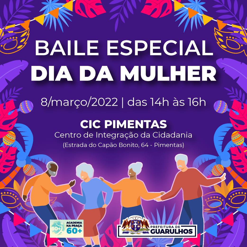 A Prefeitura de Guarulhos promoverá na terça-feira (8) o Baile 60+ Especial Dia da Mulher, das 14h às 16h, no Centro de Integração da Cidadania (CIC) Pimentas. Voltado ao público da melhor idade, o evento celebrará o Dia Internacional da Mulher, instituído pela Organização das Nações Unidas (ONU) em 1975.