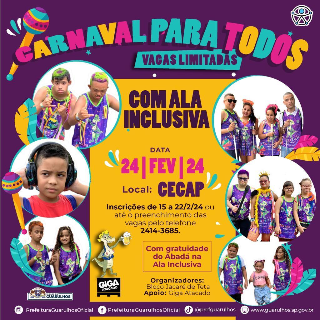 Pelo terceiro ano seguido a Subsecretaria de Acessibilidade e Inclusão de Guarulhos leva pessoas com todos os tipos de deficiência para integrar a ala inclusiva do Bloco Jacaré de Teta, que acontece no dia 24 de fevereiro no Parque Cecap. As inscrições para obter o abadá gratuito estarão abertas de 12 a 22 de fevereiro ou até o preenchimento das vagas e podem ser feitas pelo telefone 2414-3685.