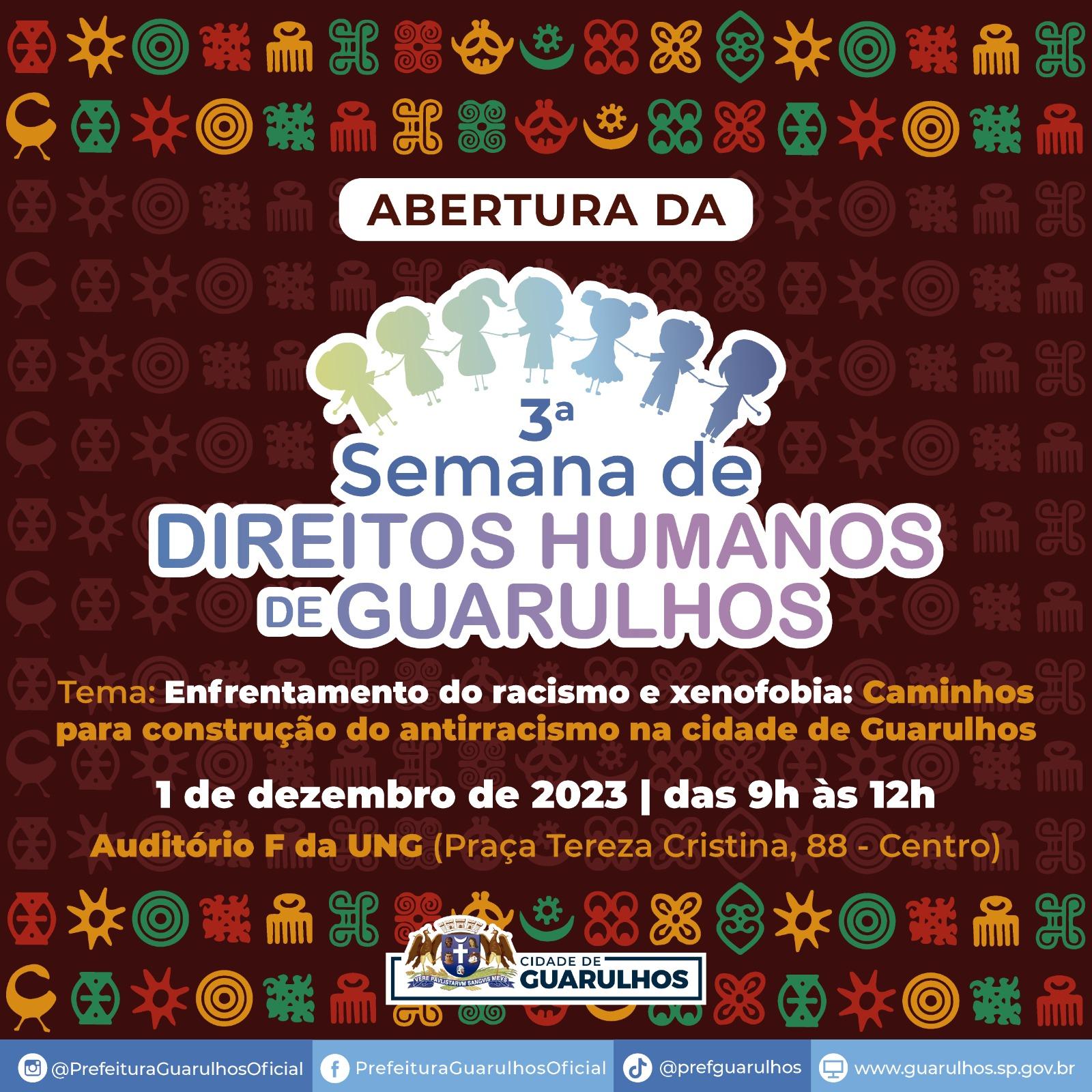 Mais de 70 eventos como debates, reflexões, atividades culturais e artísticas, bate-papos, entre outros, estão previstos na 3ª Semana de Direitos Humanos de Guarulhos, cujo tema neste ano é Enfrentamento do Racismo e Xenofobia: Caminhos para a Construção do Antirracismo na Cidade, que a Prefeitura promoverá de 4 a 10 de dezembro.