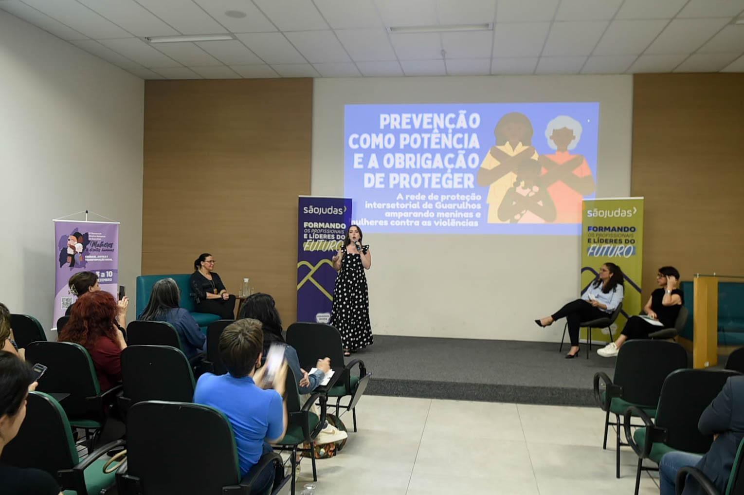Um público de cerca de 60 pessoas, entre conselheiros tutelares, membros de conselhos de Direito, servidores de diversas pastas e profissionais de organizações sociais que atuam com crianças e adolescentes participaram nesta quinta-feira (4) da roda de conversa “Obrigação de proteger: a sociedade e a garantia de direitos de crianças e mulheres”, no auditório da Universidade São Judas Tadeu, no Macedo.