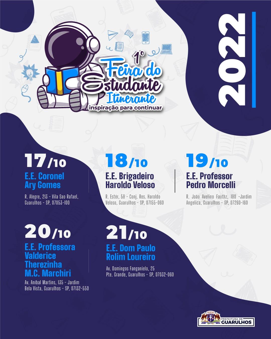 A 1ª Feira do Estudante Itinerante “Inspiração para Continuar”, promovida pela Prefeitura de Guarulhos, mobilizou nesta segunda-feira (17) 150 alunos do ensino médio da E. E. Coronel Ary Gomes, na Vila São Rafael. Agora em formato volante, a iniciativa acontece em cinco escolas estaduais ao longo da semana, cada dia em um bairro diferente.