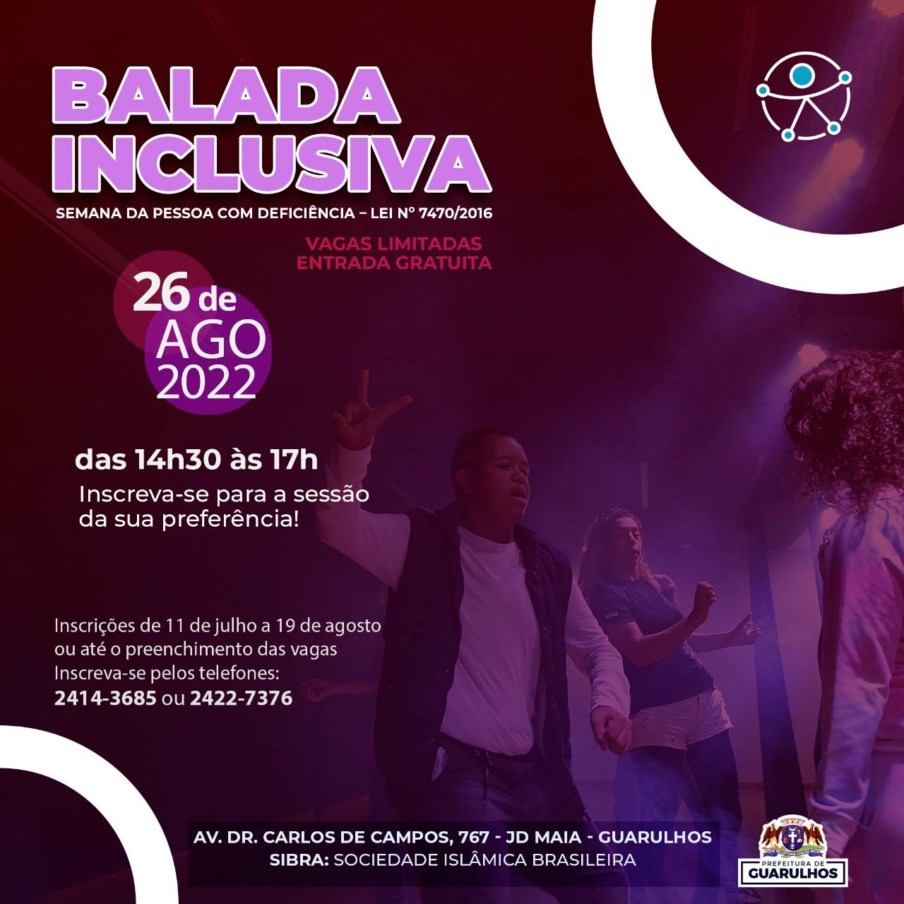 Nesta sexta-feira (26) a Prefeitura de Guarulhos promove a primeira Balada Inclusiva na Sociedade Islâmica Brasileira (Sibra), localizada à avenida Dr. Carlos de Campos, 767, Jardim Maia, em dois horários: das 14h30 às 17h e das 19h às 22h. O evento é gratuito e voltado a pessoas com deficiência de todas as idades (crianças, adolescentes, adultos e terceira idade) e os participantes inscritos poderão levar até dois acompanhantes.